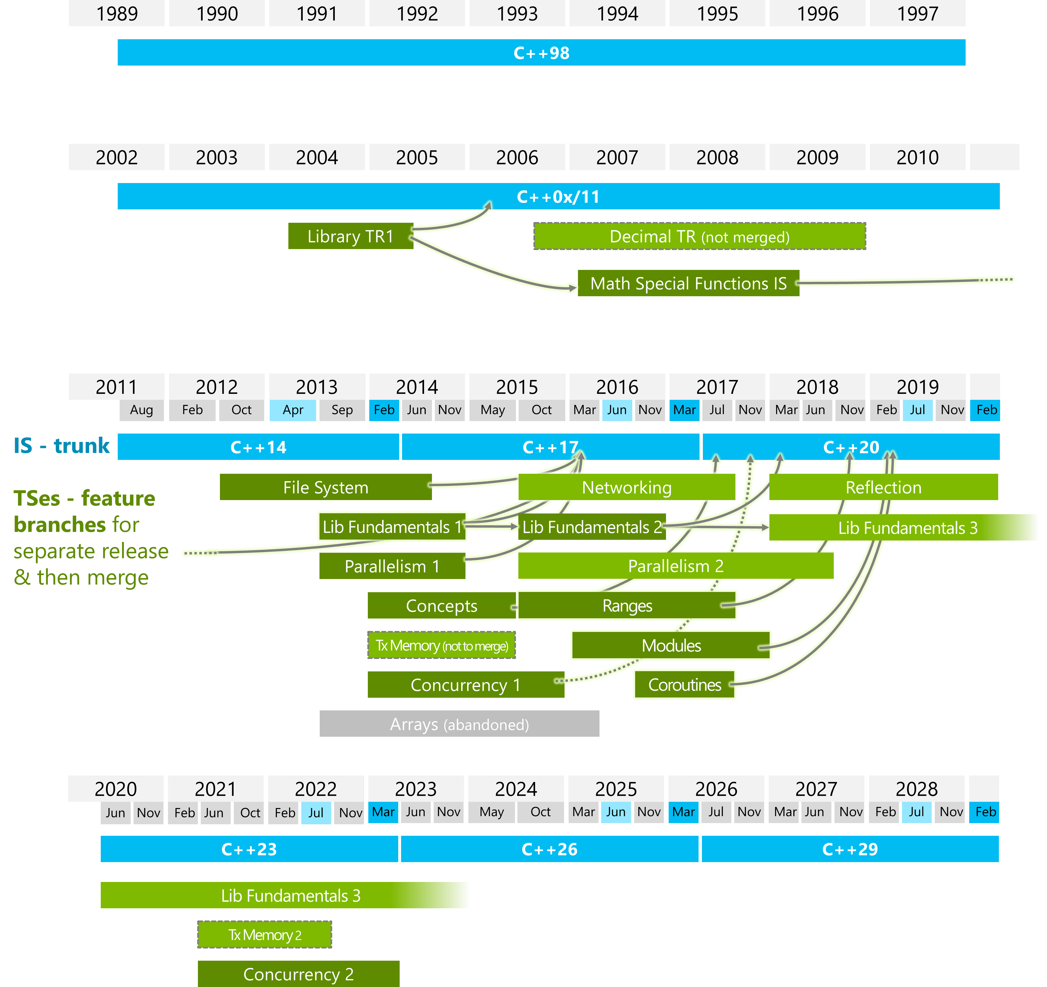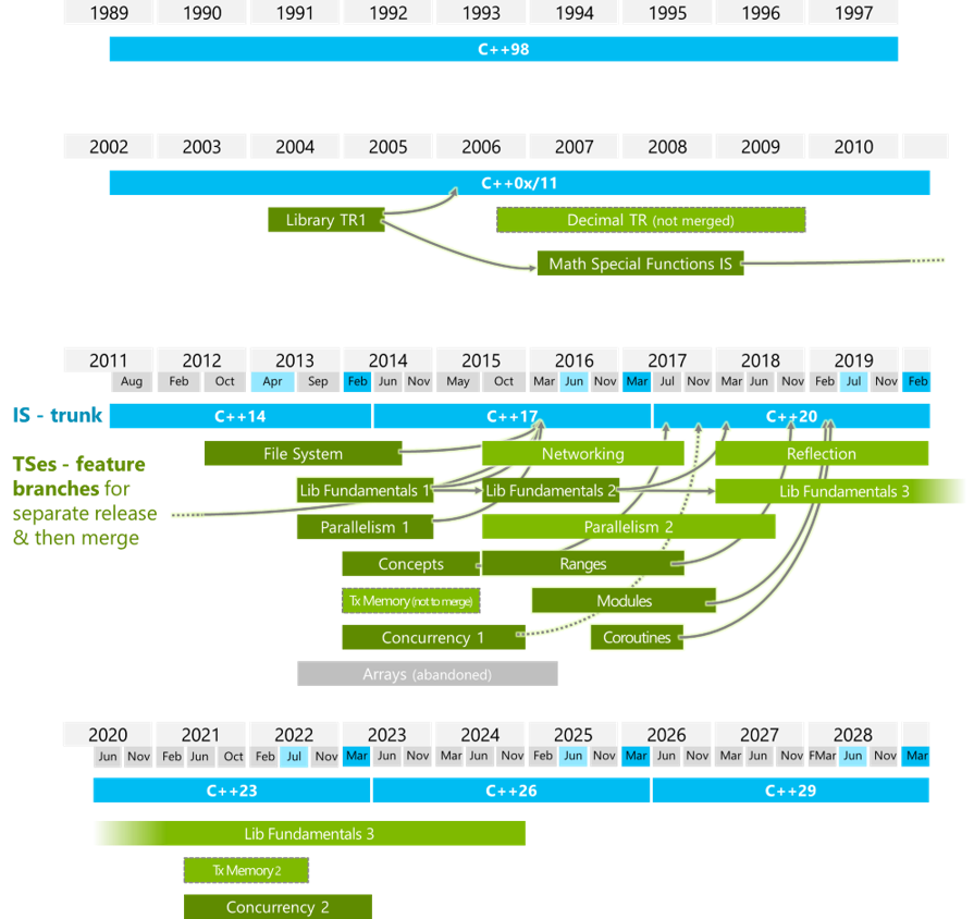 C++23 和许多 TS 已经发布,目前正在开发更多的 TS 和 C++26,如下所示。